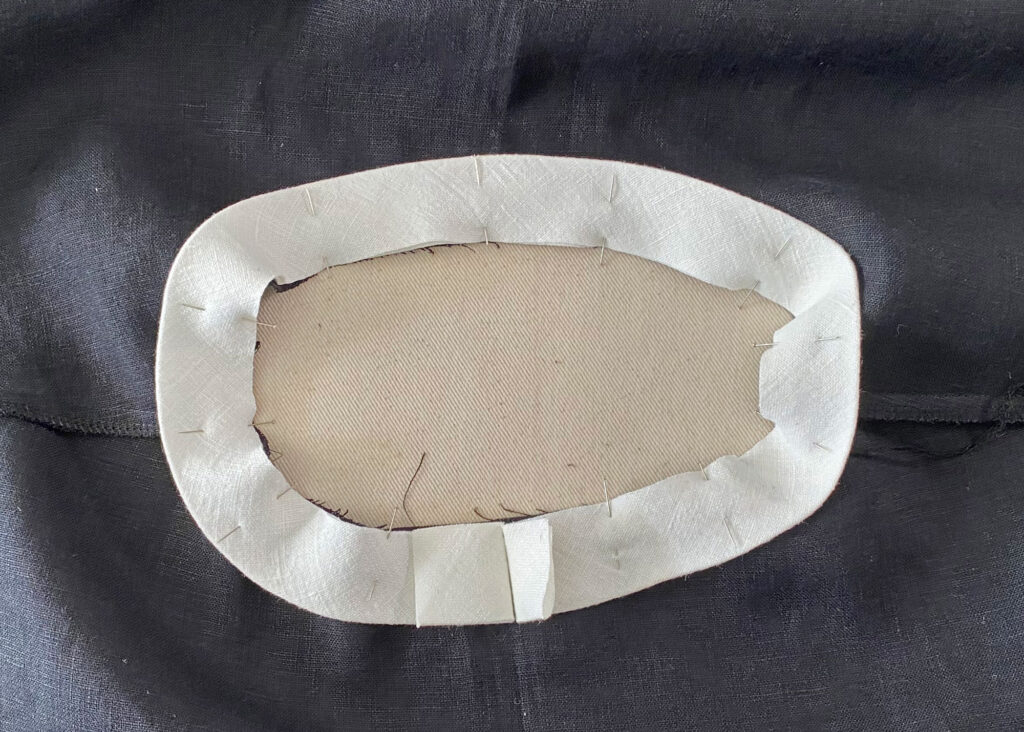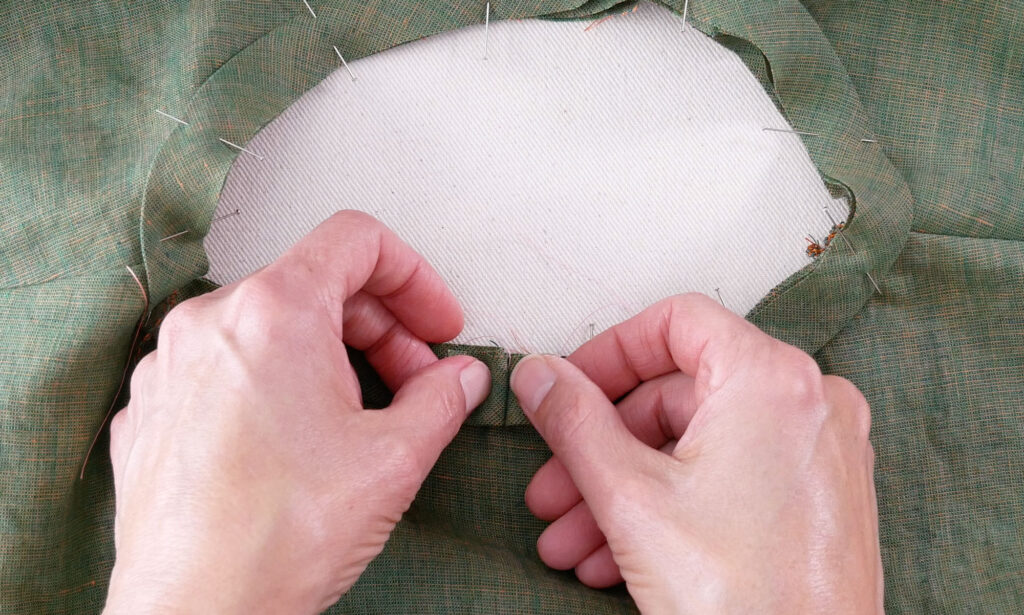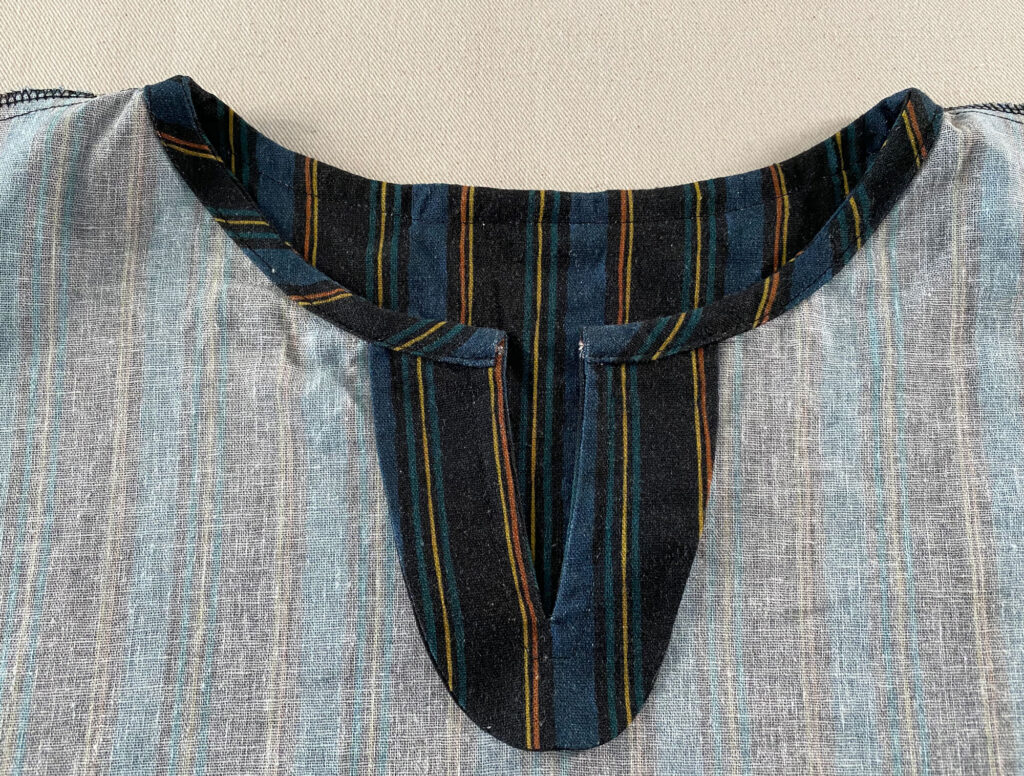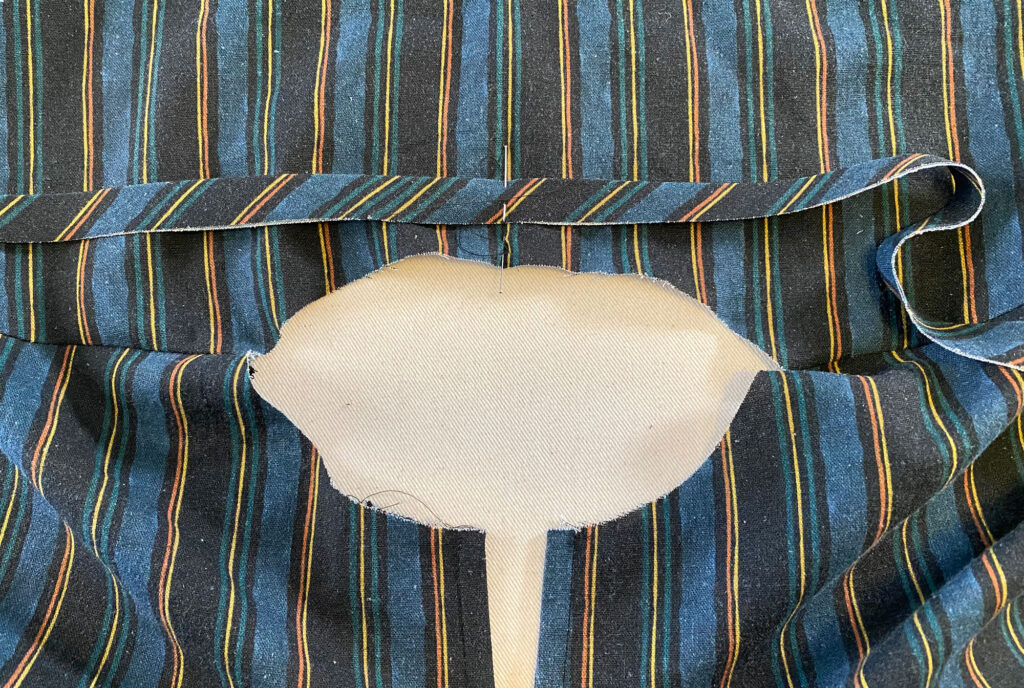 A binding strip is a narrow strip of fabric sewn to the raw edge, flipped to the inside of the garment, and sewn down in place. The stitching that holds it down is visible on the outside. The strip is cut on the bias (45-degree angle to the fabric grainline), unlike a quilt binding strip. The bias allows for some stretch, and the stretch allows the strip to go around the curve of the opening smoothly with no puckering.
