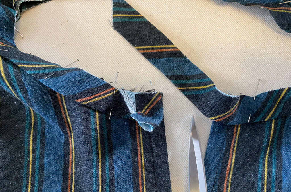 NOTE: This tutorial assumes the edges of the opening are already finished – as in a keyhole opening, a front notch, or a cuff slit (sleeves can be finished with bias strips too). Clean finishing the short ends of the bias strip would not be necessary if the edges of the opening are finished after the neckline is finished.