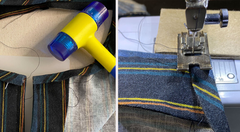 The opening ends can become bulky. It might be helpful to pound them with a mallet. To prevent your machine from getting “stuck” when sewing over the bulk, use a piece of folded cardboard, folded fabric, a jean jig, whatever you have that can be slipped behind the fabric to keep the presser foot even (parallel to the stitch plate) as it sews over the bulky section.