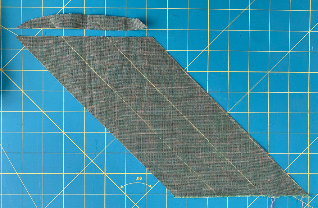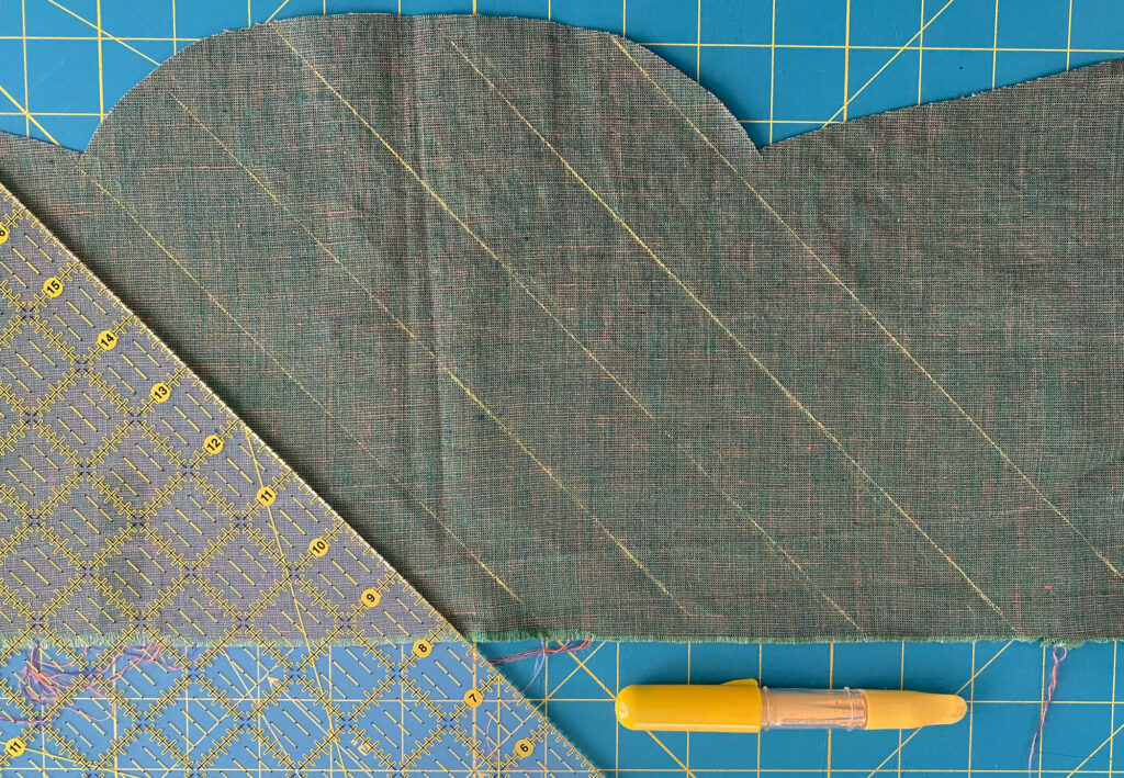 To cut the strip, I usually measure and mark it directly onto the fabric with fabric chalk. This is what you’ll do when patterns don’t include a drafted bias binding piece, or if you want to piece smaller strips to make the length you need.