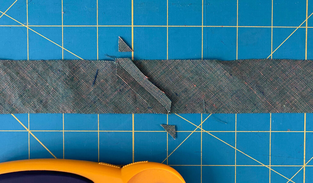 When sewing the bias strip ends together, have the strip unfolded. Sew across the strips on the crease you just made. Trim the seam allowance and finger-press it open.