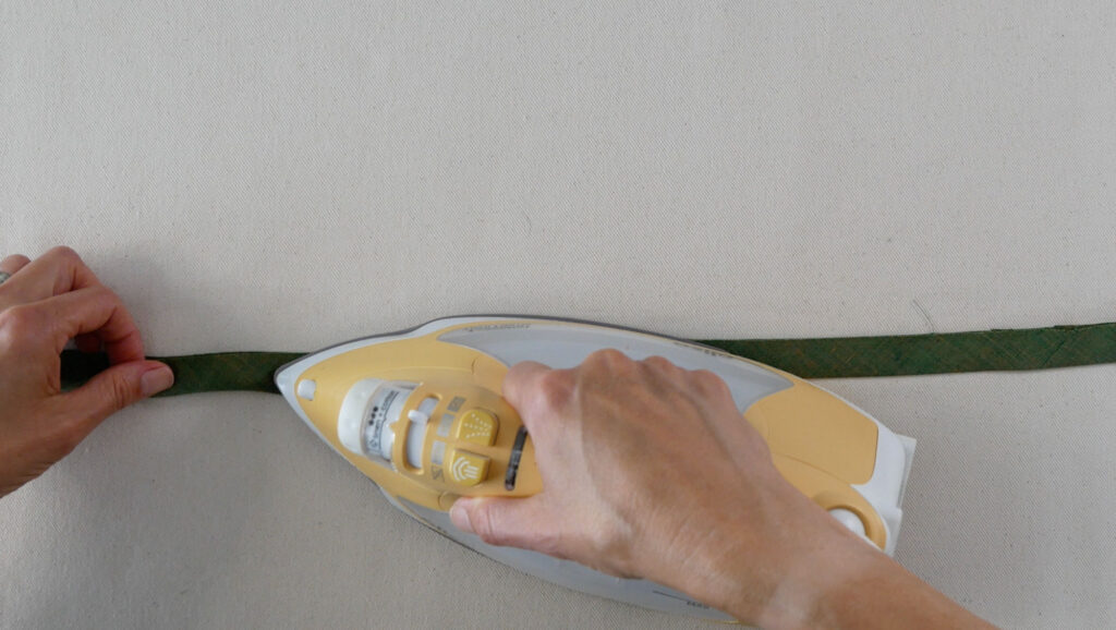 Fold the bias strip in half lengthwise, wrong sides together, and press. It is important that you don’t stretch the strip as you iron it. It will stretch very easily, and you might think you’re not stretching it, but take caution that it is indeed not being stretched. If it gets stretched, it will not be as wide as it needs to be to finish the neckline.