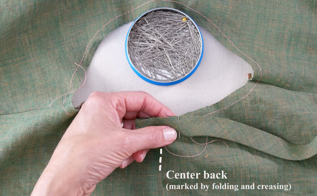 When you get close to the center back, stop pinning the binding down, but continue to lay it down as if pinning. Bring the two ends of the strip together at the center back. Butt them up to each other and fold over the excess to form a crease. The creases mark where you will stitch the two strips together.