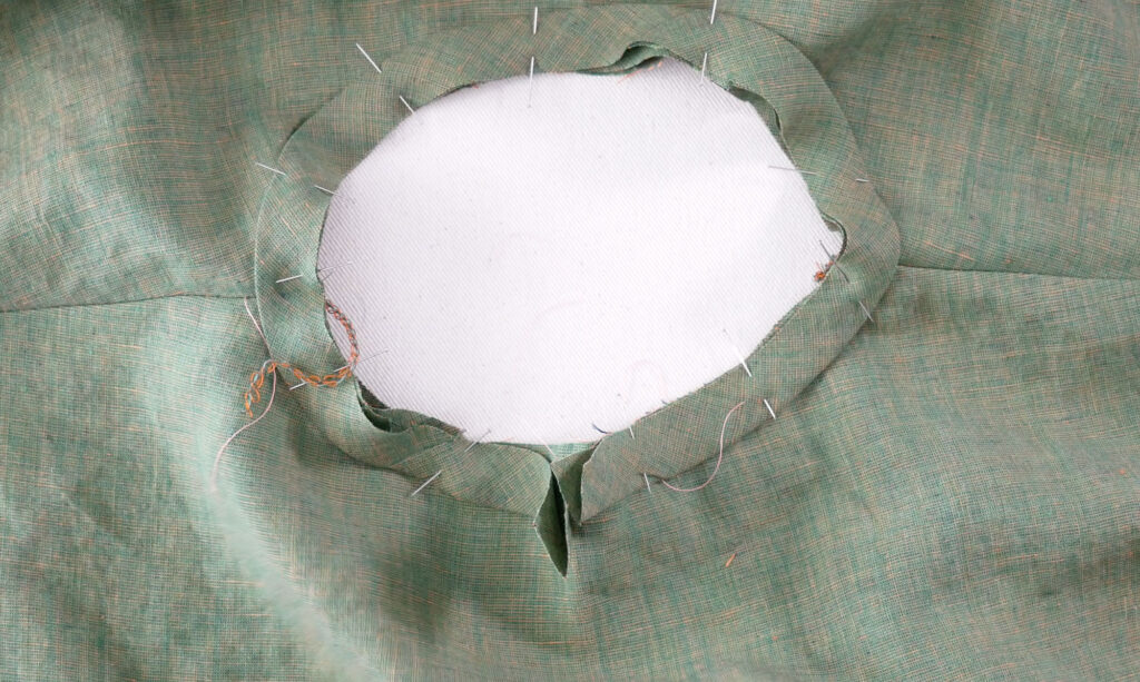 Starting about an inch in from one end of the bias strip, pin the binding at the edge of the neck opening. Or, starting in the middle of the binding strip, pin it to the neckline, at either center back or center front, whichever is opposite the opening at the neckline.