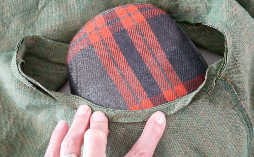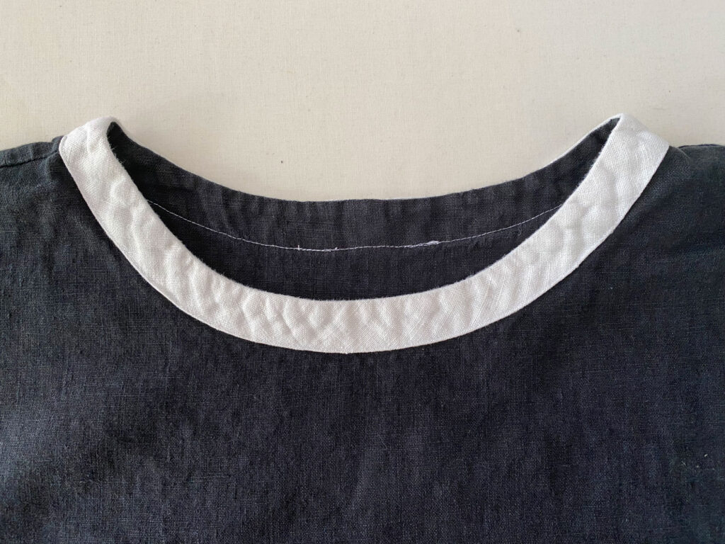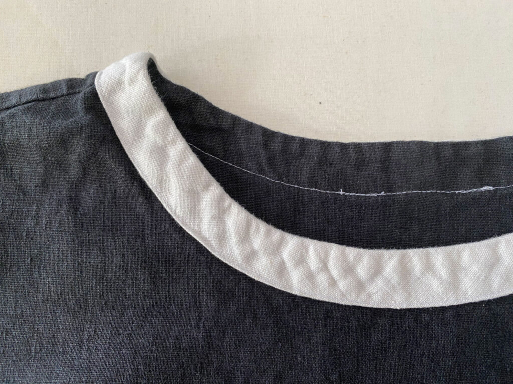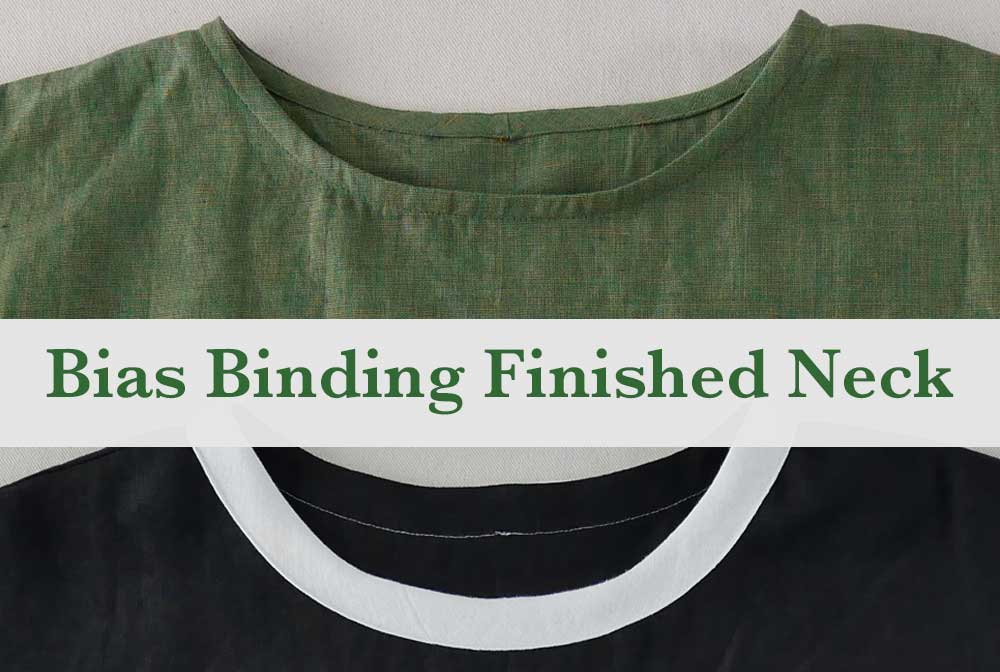 There was a time when all home patterns included a facing. A facing is wider than a binding and can be shaped to include armholes or other features. A facing uses more fabric but offers more structure. It can also be fairly invisible, as it often does not require machine stitching on the outside of the garment to hold it in place.