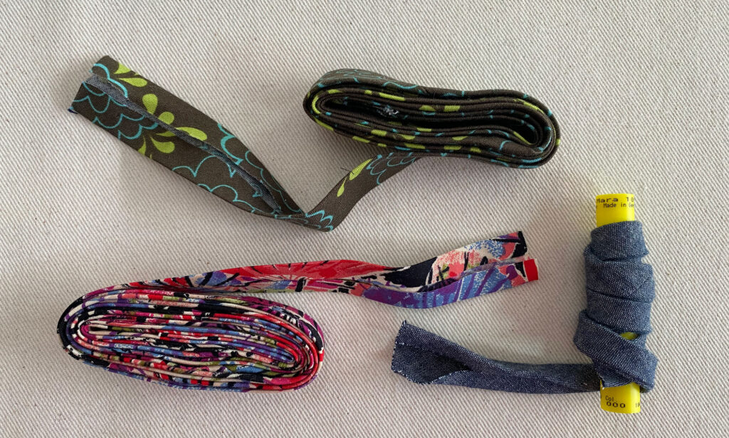 While multiple, shorter strips save fabric, consider that piecing the strips means more seams and more bulk in the binding when done. This is why I prefer making bindings from light to medium-weight fabrics. Nothing heavier than a quilting cotton. In fact, when I have scraps of fun fabric, I will turn them into bias binding strips, ready to be used on whatever project turns up.